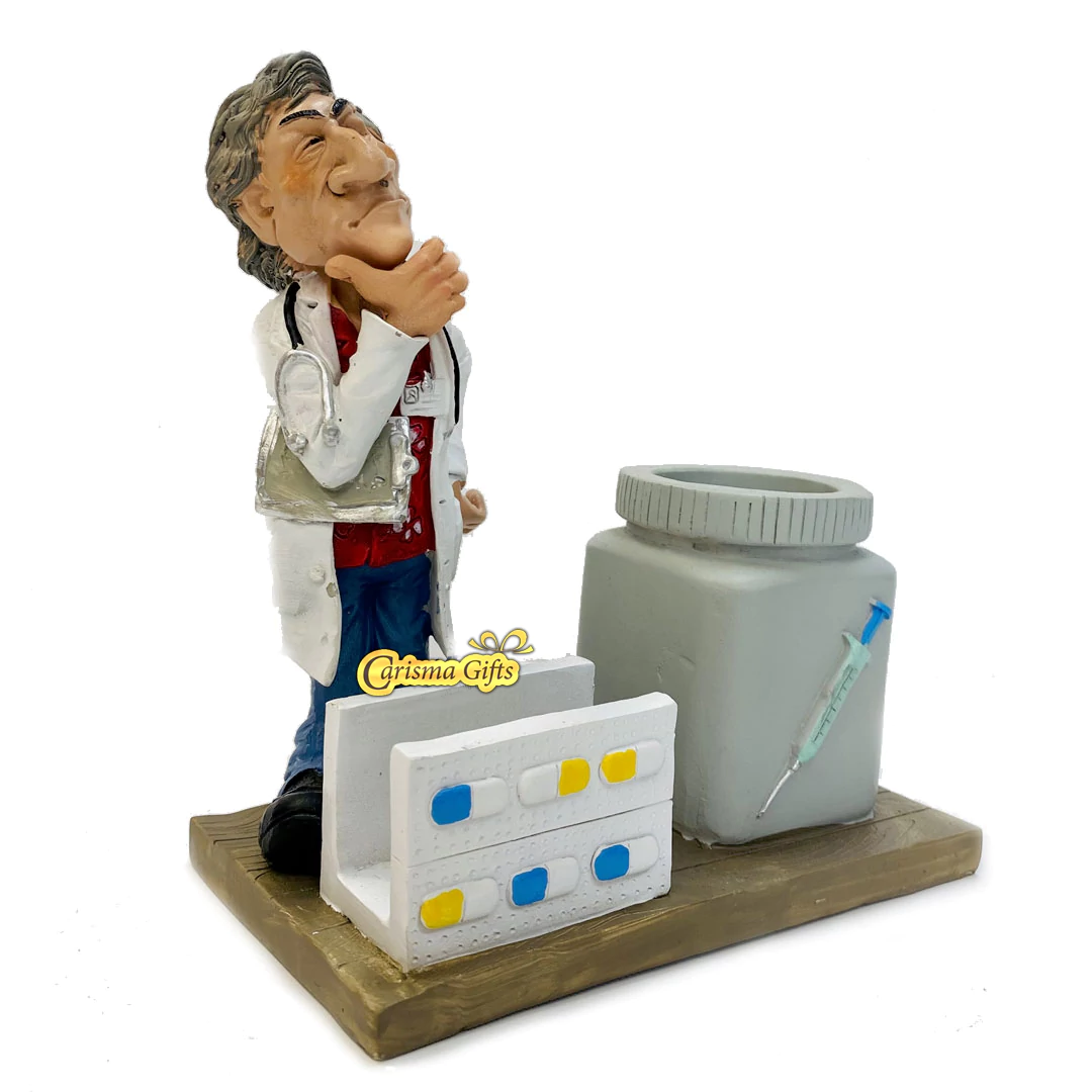 מעמד שולחני קריקטורה רופא (דוקטור) נושא סטטוסקופ עם כוס לעטים וכרטיסי ביקור