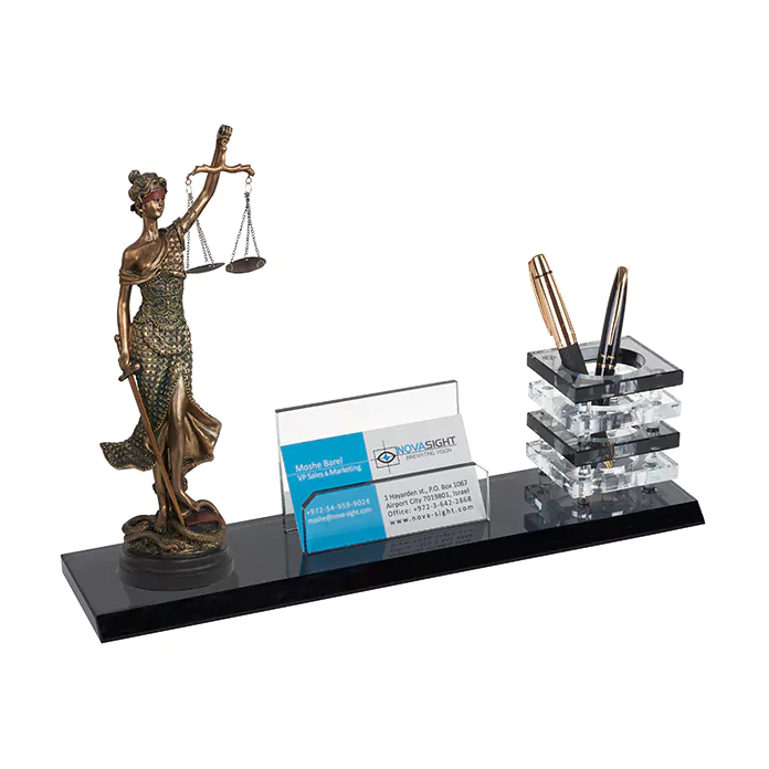 מעמד קריסטל “אלת הצדק” לשולחן העבודה, כולל כוס לעטים ומעמד לכרטיסי ביקור, עם אפשרות לחריטה אישית.