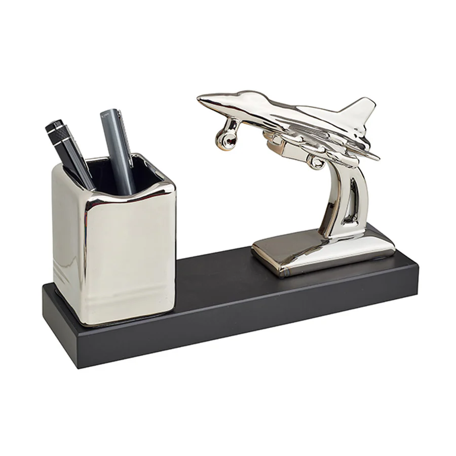 מעמד שולחני בצורת מטוס עם כוס עטים – שילוב בין עיצוב מרשים ופונקציונליות.